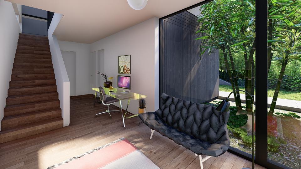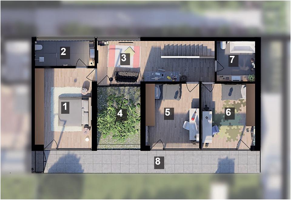 Der Zugang zur Wohnung kann auch direkt von der Garage aus erfolgen. Vom Eingangsbereich aus erstreckt sich ein Open Space Grundriss mit Wohn- und Essbereich, Küche, Gästetoilette und Dachterrasse. In der unteren Etage befinden sich die Privaträume mit drei Schlafzimmern und zwei Badezimmern (Dusch- und Wannenbad) sowie Arbeits-/Spielbereich und Gartenfläche.